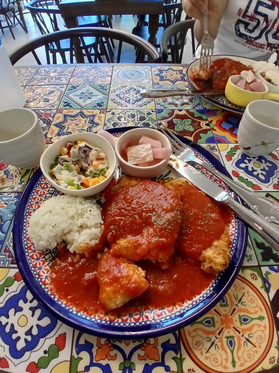 경북도청 옆 골목에 자리한 이 돈가스집은 화사한 타일 테이블과 감각적인 인테리어가 먼저 눈에 들어오는 곳입니다. 접시에 가득 담긴 토마토 풍미의 소스와 바삭한 튀김옷이 어우러진 돈가스는 한입 먹는 순간부터 만족감을 줍니다. 곁들여 나온 고슬고슬한 밥, 상큼한 콘샐러드, 새콤한 절임무까지 균형 잡힌 한 끼로 데이트나 가족외식에 적합한 분위기와 맛을 동시에 갖춘 가게입니다. 기억나지 않지만 중학교 부근입니다. 성당을 다니고 있었습니다.